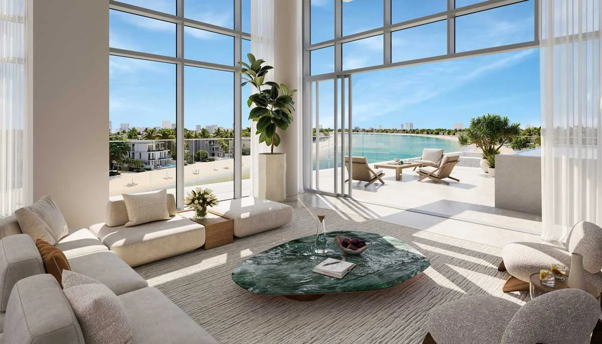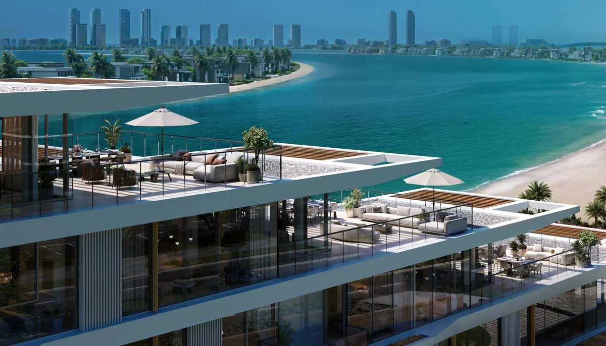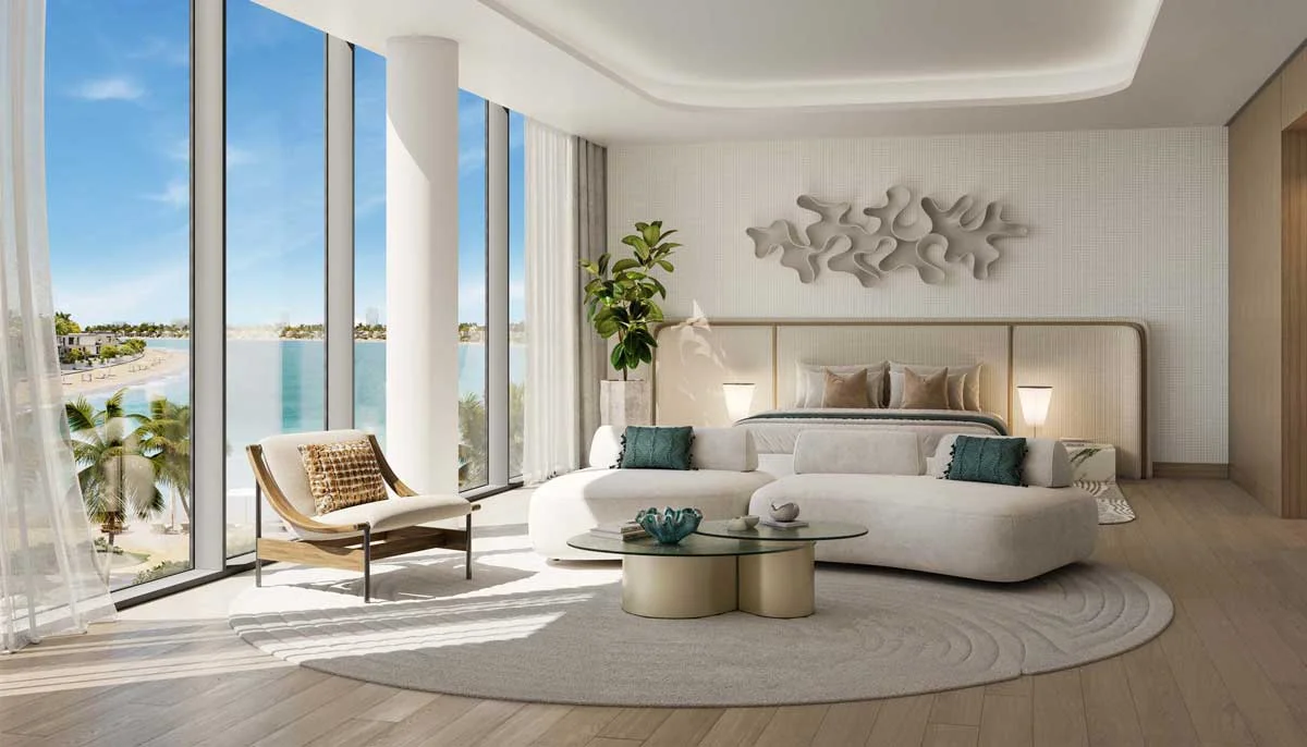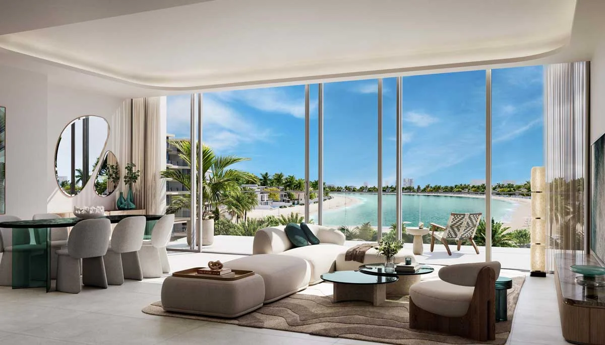 Most residences feature direct sea views or panoramic vistas of the Palm Jebel Ali waterfront, with select units enjoying sunset views over the Arabian Gulf.