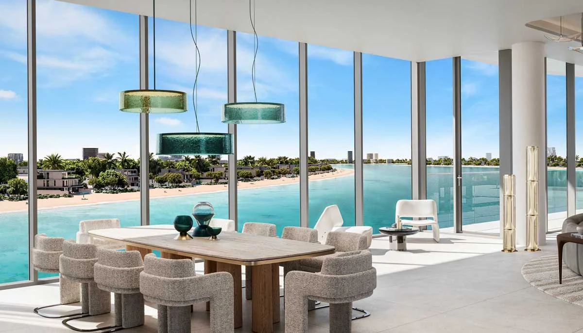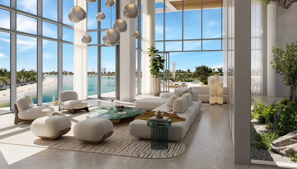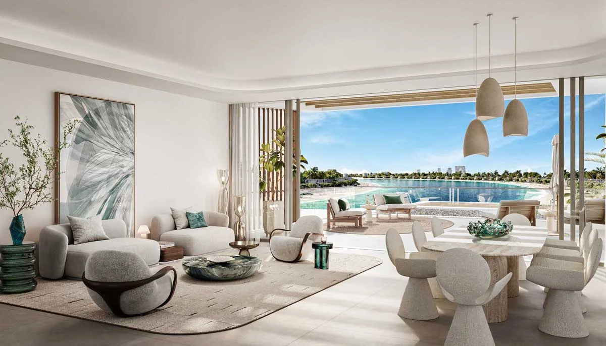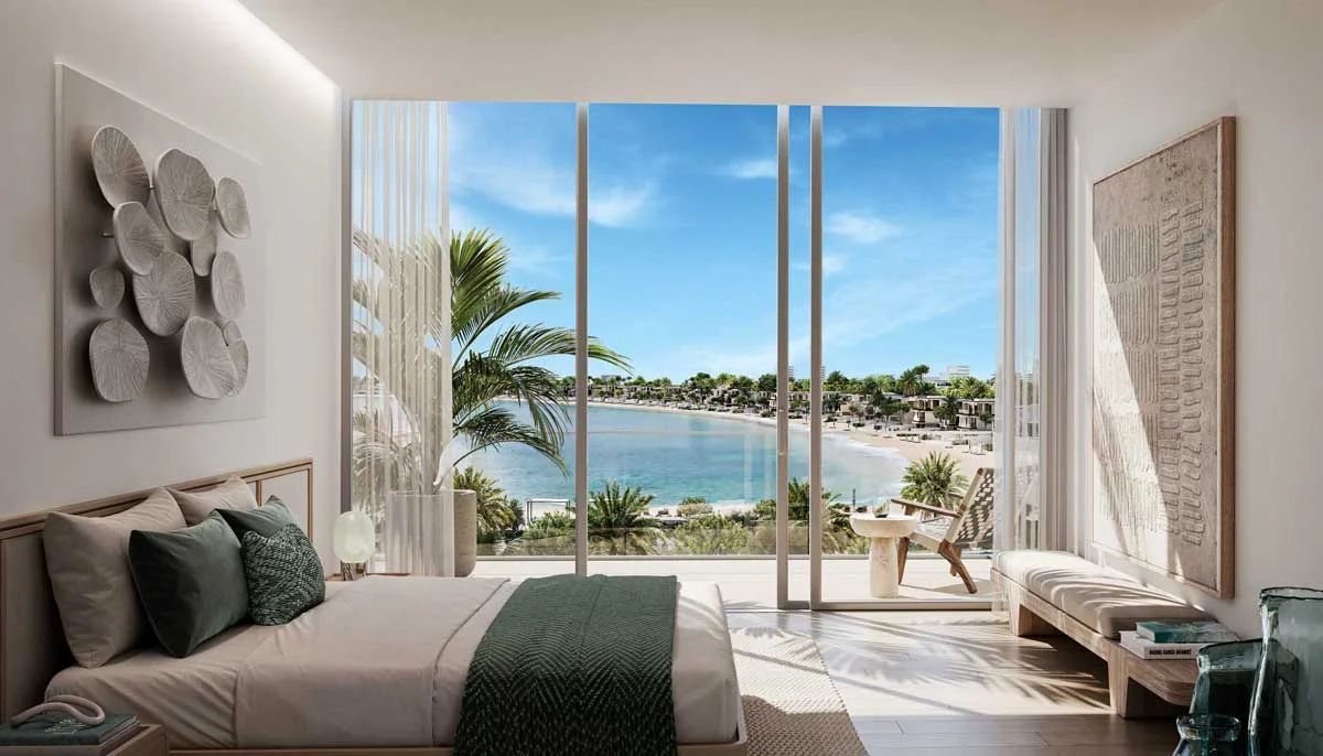 Most residences feature direct sea views or panoramic vistas of the Palm Jebel Ali waterfront, with select units enjoying sunset views over the Arabian Gulf.